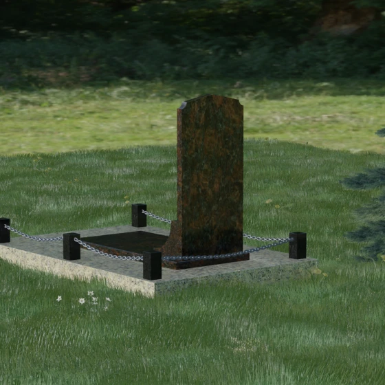 Геометрия стелы идеально приспособлена для размещения портрета в верхней части. Овальный медальон, расположенный по центру, визуально уравновешивает композицию, находясь над «аркой» с текстом. Золоченая гравировка на светлом фоне арки читается легко и четко даже с расстояния. Завершенность участку придают массивные гранитные столбики, соединенные тяжелыми декоративными цепями. Это ограждение не загромождает пространство, но четко обозначает границы частной территории, создавая атмосферу уединения и защищенности. Каждая деталь — от формы фаски на столбиках до надежных креплений цепей — продумана мастерами-камнерезами для того, чтобы мемориал стал достойным воплощением вашей любви и незыблемой памяти на долгие века.