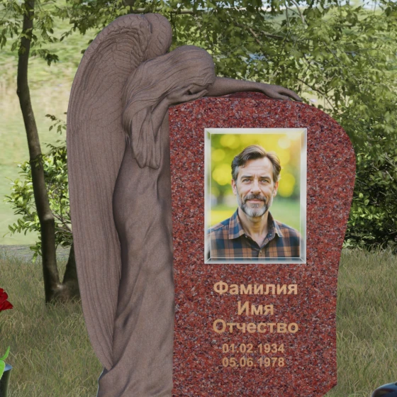 Центральным художественным элементом композиции является искусная скульптура скорбящего ангела, выполненная в технике глубокого барельефа. Фигура небесного защитника органично интегрирована в левую часть каменного полотна. Мы видим детальную проработку каждого перышка на опущенных крыльях, мягкие, ниспадающие складки плащаницы и кроткий изгиб шеи — ангел склонил голову в знак вечного сострадания. Особого внимания заслуживает игра фактур: матовая, бархатистая поверхность резной фигуры контрастирует с безупречным зеркальным блеском основной плоскости, на которой располагается портрет и эпитафия. Такая полировка создает эффект глубокого черного или цветного зеркала, в котором отражается небо, символизируя связь между земным и небесным.