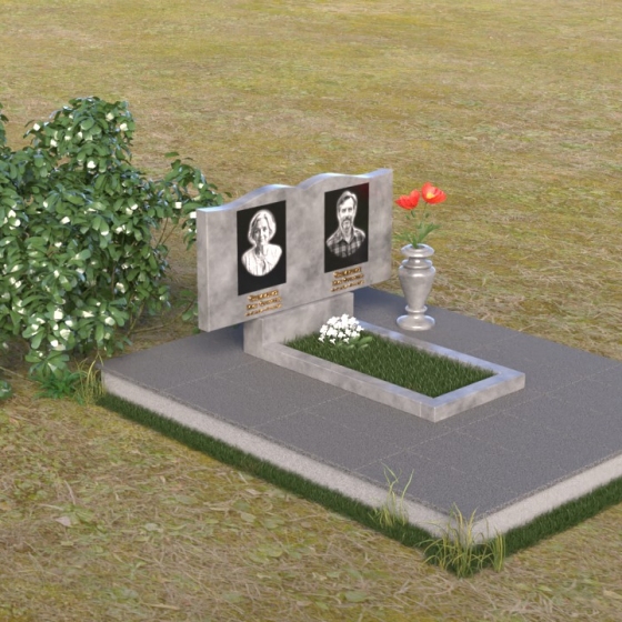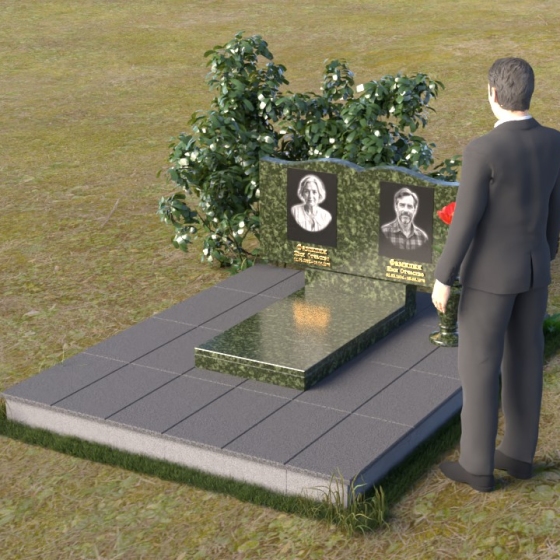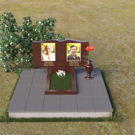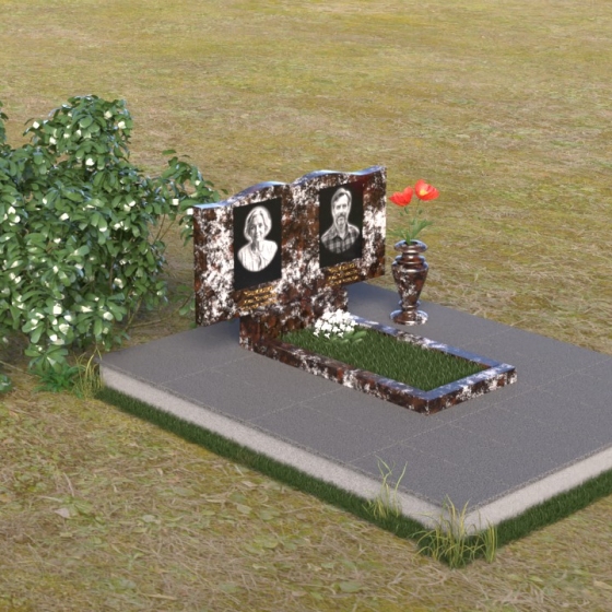 Этот гранитный монумент представляет собой вертикальную композицию, где основной акцент сделан на верхней части. Верхний край памятника имеет сложную, волнообразную форму, напоминающую плавные изгибы морской волны или нежные лепестки цветка. Этот элемент придает монументу легкость и изящество, смягчая строгость камня. Боковые грани монумента обработаны таким образом, чтобы подчеркнуть его вертикальность и стройность. Фаски по краям смягчают переход от лицевой поверхности к боковым, создавая ощущение завершенности и гармонии. Лицевая сторона монумента отполирована до зеркального блеска, отражая небо и окружающий мир, словно запечатлевая в себе вечность. На полированной поверхности выгравированы портреты усопших, выполненные с высокой степенью детализации. Под портретами расположены надписи с именами и датами жизни, выполненные строгим, элегантным шрифтом.