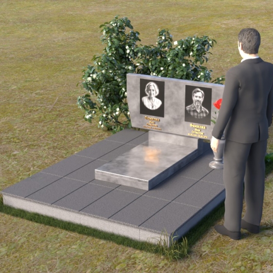 Это ритуальное изделие представляет собой гармоничное сочетание прямых линий и мягких, едва уловимых изгибов, создающих ощущение покоя и умиротворения. Стела имеет прямоугольную форму, но ее верхняя грань слегка скошена, что придает ей визуальную легкость и динамику. Обратите внимание на зеркальную полировку лицевой стороны – она отражает небо и окружающий мир, словно заключая в себе вечность. На полированной поверхности выгравированы портреты усопших и памятные надписи, выполненные с высокой точностью и детализацией. Слева от стелы, на основании, располагается небольшая горизонтальная плита с аналогичной полировкой, создающая дополнительное пространство для цветов или памятных предметов. Основание памятника выполнено из серого камня с матовой фактурой, что создает контраст с блестящей стелой и придает композиции устойчивость и завершенность. Рядом с плитой установлена ваза, выполненная из того же черного полированного гранита, что и стела, что обеспечивает единство стиля и служит достойным обрамлением для живых цветов, символизирующих вечную память.