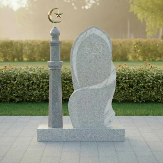 Поверхность стелы представляет собой великолепную игру контрастов. Основная часть выполнена из глубокого черного гранита с зеркальной полировкой, которая отражает свет, создавая ощущение глубины и торжественности. На этом фоне выделяется вставка из светлого мрамора, расположенная в верхней части и плавно переходящая в изящную волну, опоясывающую стелу. Эта вставка, напоминающая очертания исламского полумесяца, символизирует свет и надежду. На матовой поверхности светлого мрамора искусно выгравированы каллиграфические узоры, которые добавляют монументу культурную и духовную ценность. В нижней части стелы, на черном граните, также присутствует тонкий орнамент, выполненный в технике гравировки, который подчеркивает изысканность и детализацию всей работы.