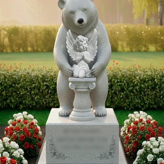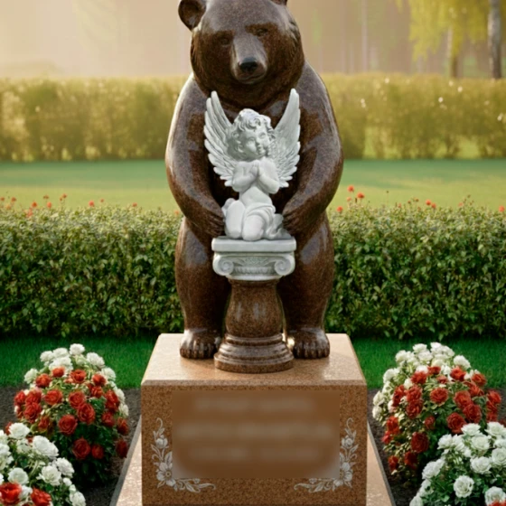 Выбор образа медведя в качестве хранителя не случаен — это символ силы, защиты и непоколебимого спокойствия. В данной интерпретации могучий зверь выступает защитником души, олицетворенной в образе маленького ангела. Ангел с молитвенно сложенными руками и детально проработанными перьями на крыльях символизирует чистоту, надежду и связь с высшими силами. Вся архитектурная группа транслирует идею безопасности: покой ушедшего человека находится под надежной защитой, которую не в силах разрушить ни время, ни внешние обстоятельства. Это воплощение вечной опеки и преданности, застывшее в граните.