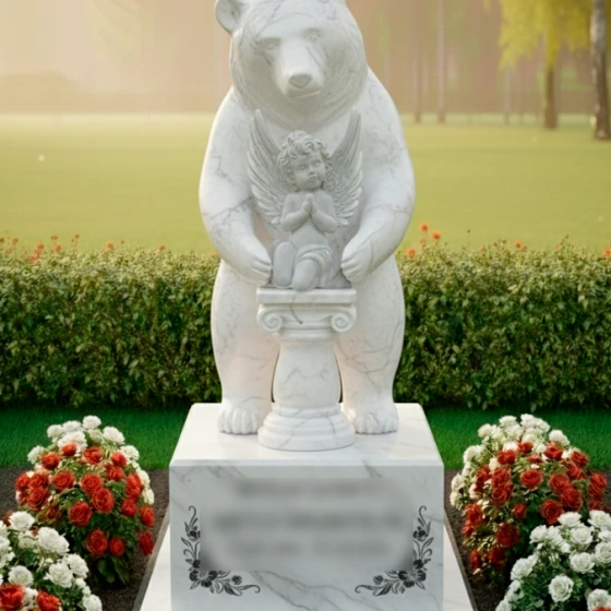 Центральным элементом композиции является величественная фигура медведя, выполненная из цельного массива камня с безупречной зеркальной полировкой. Фигура животного поражает своей массивностью и детальной проработкой: мягкие изгибы ушей, сосредоточенный взгляд и мощные лапы, которые бережно удерживают центральный символ. Внутренняя часть композиции представляет собой резной постамент в античном стиле, на котором покоится белоснежная скульптура молящегося ангела. Контраст между темным, глубоким цветом основного камня и ослепительно светлой фактурой херувима создает невероятный визуальный эффект объема.