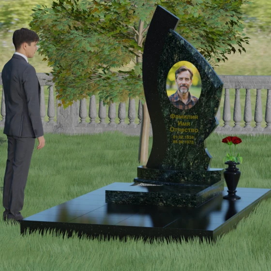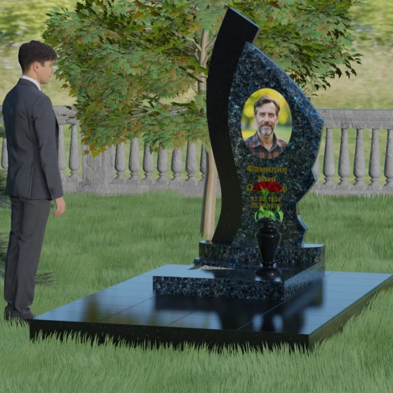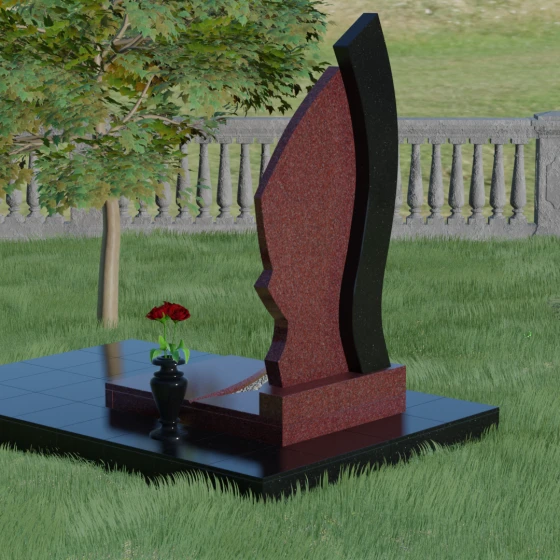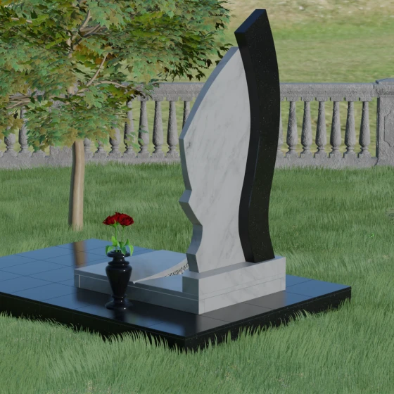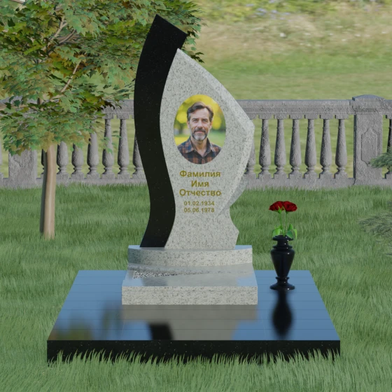 Форма этого памятника глубоко символична. Асимметрия олицетворяет жизненный путь — не всегда ровный, но всегда уникальный. Сочетание двух разных пород камня в одной стеле символизирует неразрывную связь души и тела, земного и вечного. Плавный изгиб верхней кромки напоминает защитное крыло или тихую волну памяти, уносящую печаль, оставляя лишь светлые воспоминания. Этот монумент внушает чувство покоя и защиты, словно оберегая покой ушедшего своей массивной и надежной конструкцией.
