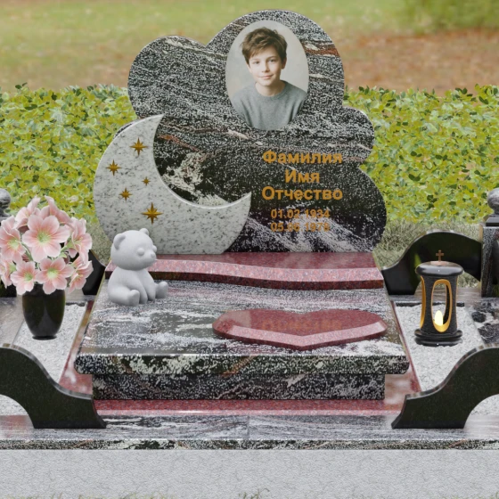Данная мемориальная композиция — это воплощение нежности, глубокой любви и тихой грусти, застывшей в благородном камне. Выбор такой формы продиктован желанием выразить самые светлые чувства к ушедшему близкому человеку. Силуэт стелы, выполненный в виде мягкого, кучевого облака с плавными, округлыми очертаниями, символизирует покой и вечную жизнь души в небесных сферах. Асимметричная геометрия придает монументу индивидуальность, выделяя его среди строгих прямоугольных форм, и создает ощущение легкости, несмотря на внушительный вес натурального гранита. Особый акцент сделан на игре фактур и цветов: основная часть монумента из темного камня гармонично сочетается со вставкой из светлого гранита в форме изящного полумесяца. На этом светлом фоне выгравированы лаконичные золотые звезды, которые словно освещают путь памяти через десятилетия.