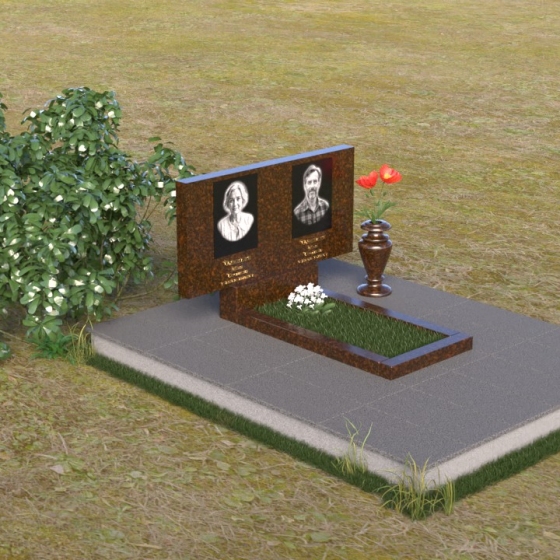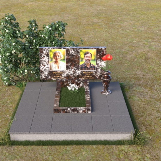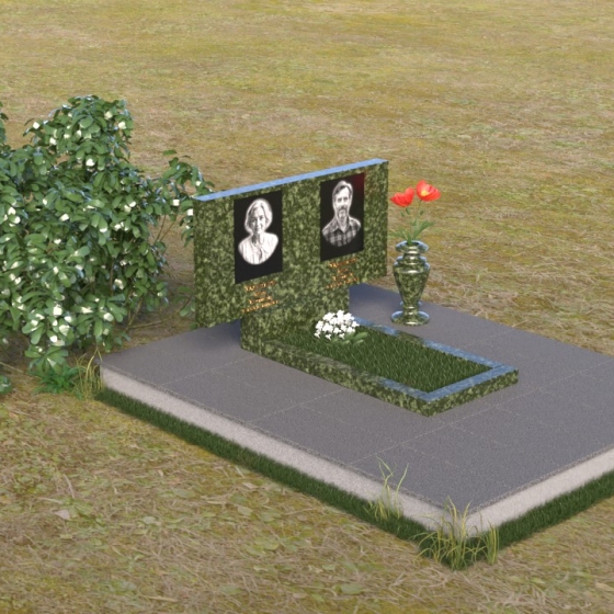 Представленный памятник (артикул ПГ001) являет собой образец строгости и лаконичности, где каждая деталь подчинена общей концепции увековечивания памяти. Композиция состоит из основания, облицованного серыми плитами, горизонтальной плиты, и вертикальной плиты с портретами. Дополнительно предусмотрена тумба для вазы.