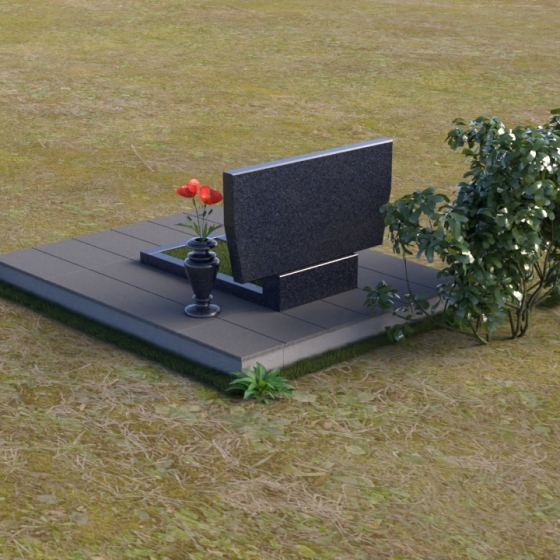 Это ритуальное изделие представляет собой гармоничное сочетание прямых линий и мягких, едва уловимых изгибов, создающих ощущение покоя и умиротворения. Стела имеет прямоугольную форму, но ее верхняя грань слегка скошена, что придает ей визуальную легкость и динамику. Обратите внимание на зеркальную полировку лицевой стороны – она отражает небо и окружающий мир, словно заключая в себе вечность. На полированной поверхности выгравированы портреты усопших и памятные надписи, выполненные с высокой точностью и детализацией. Слева от стелы, на основании, располагается небольшая горизонтальная плита с аналогичной полировкой, создающая дополнительное пространство для цветов или памятных предметов. Основание памятника выполнено из серого камня с матовой фактурой, что создает контраст с блестящей стелой и придает композиции устойчивость и завершенность. Рядом с плитой установлена ваза, выполненная из того же черного полированного гранита, что и стела, что обеспечивает единство стиля и служит достойным обрамлением для живых цветов, символизирующих вечную память.