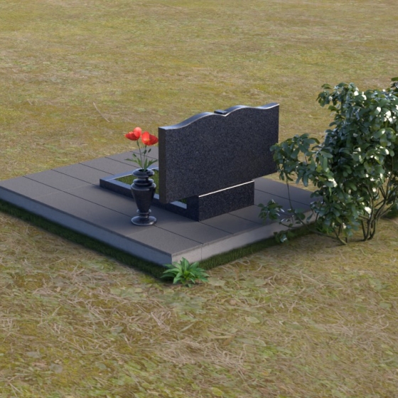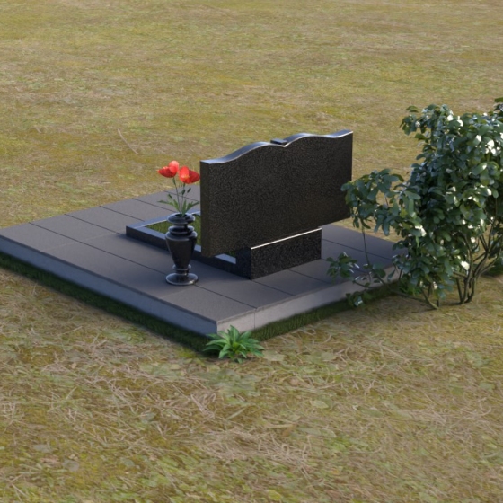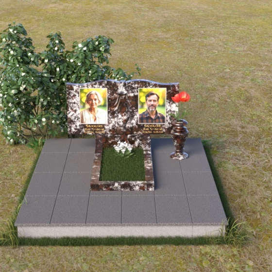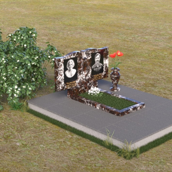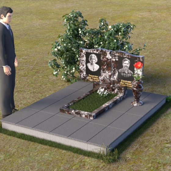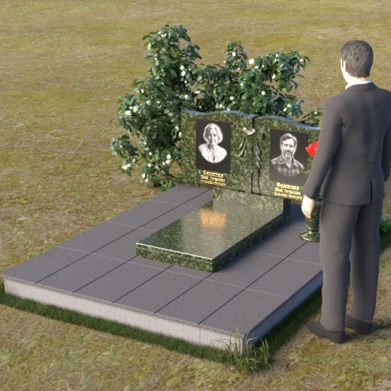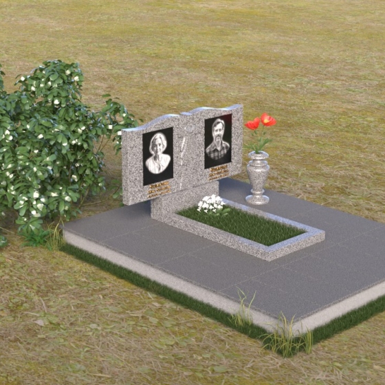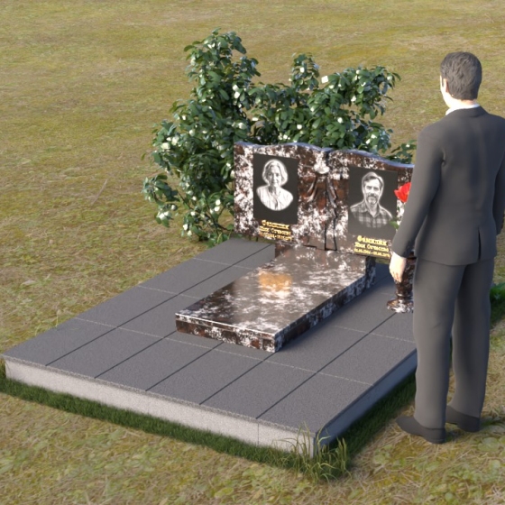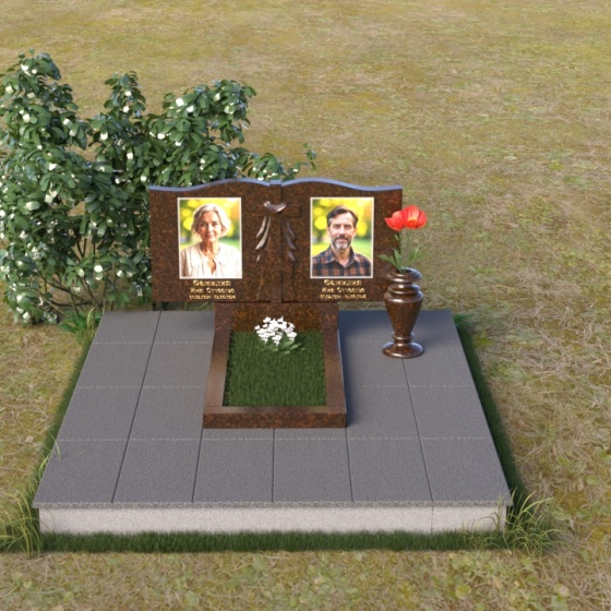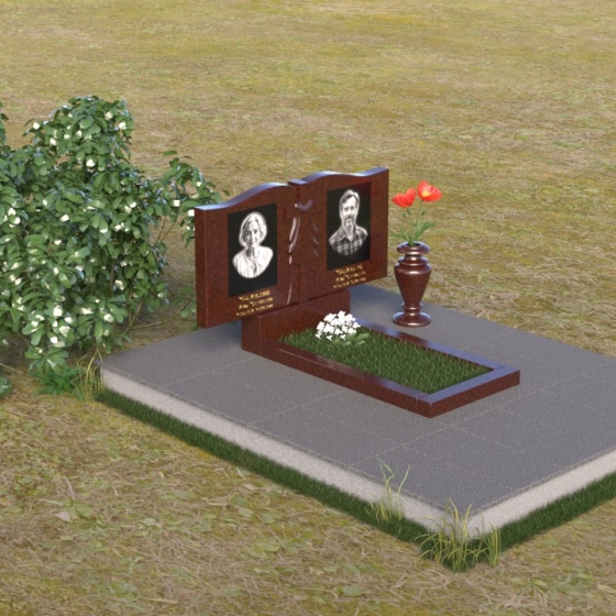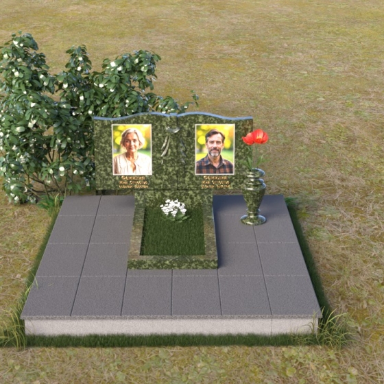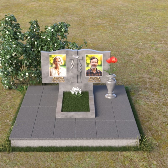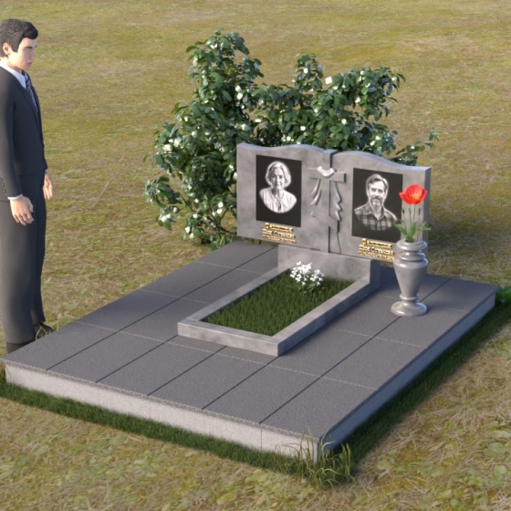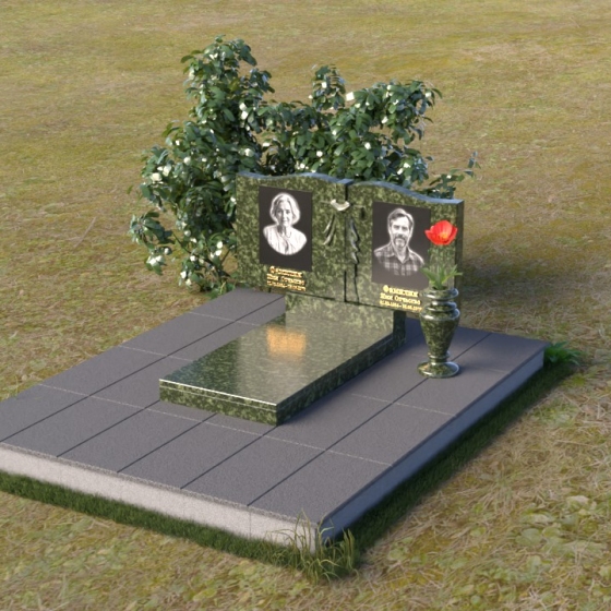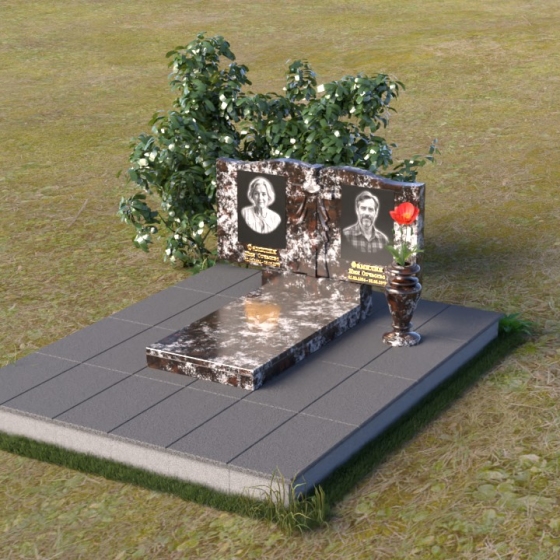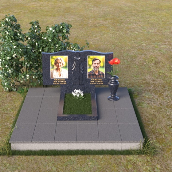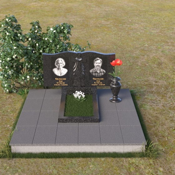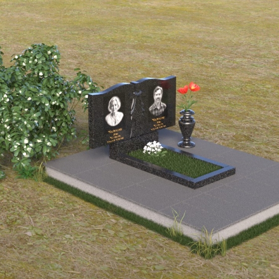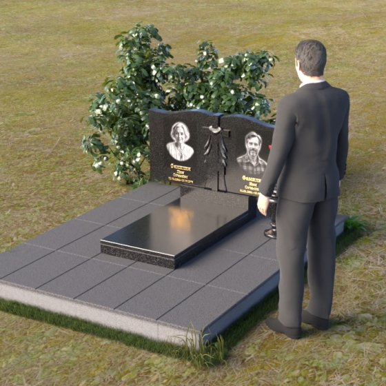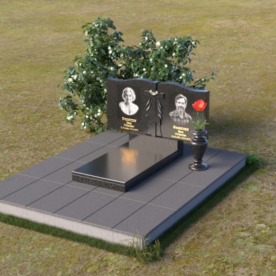Данная мемориальная композиция представляет собой две стелы, выполненные из полированного гранита глубокого черного цвета, соединенные между собой. Каждая стела имеет мягкую, волнообразную форму верхней части, словно склоненную в тихой скорби. Боковые грани плавно скруглены, что придает изделию мягкость и элегантность. На лицевой поверхности стел выгравированы портреты, имена и даты, выполненные с высокой детализацией. Разделяет стелы искусно вырезанный крест, лаконичный и строгий, устремленный ввысь. Его грани контрастируют с полированной поверхностью, создавая игру света и тени, придающую рельефу дополнительный объем. Под стелами располагается горизонтальная плита, также выполненная из черного гранита, с зеркальной полировкой, отражающей небо и окружающий мир, символизируя вечность и непрерывность жизни. Дополняет композицию изящная ваза из гранита, предназначенная для живых цветов, которые станут символом любви и памяти.