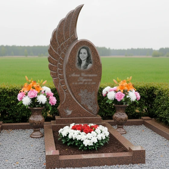 Кому подойдет: Этот мемориальный комплекс идеально подойдет для тех, кто ищет не просто памятник, а уникальное произведение искусства, способное глубоко и трогательно выразить светлую память о близком человеке. Его плавные, обтекаемые формы и символика крыла делают его особенно подходящим для увековечивания памяти о женщинах, чья жизнь была наполнена нежностью, грацией и духовностью. Мемориал станет достойным символом вечного покоя и возвышенной памяти, отражая индивидуальность и значимость ушедшего. Возможность выбора из 8 цветовых решений — 7 видов гранита (гранит амфиболит, гранит Балтик грин, гранит Блю Перл, гранит Габбро-диабаз, гранит Дымовский, гранит Лезниковский, гранит Мансуровский) и 1 вид мрамора (мрамор Тассо) — позволяет подобрать камень, который наиболее точно соответствует характеру и предпочтениям усопшего, создавая по-настоящему персонализированный и глубоко символичный мемориал.