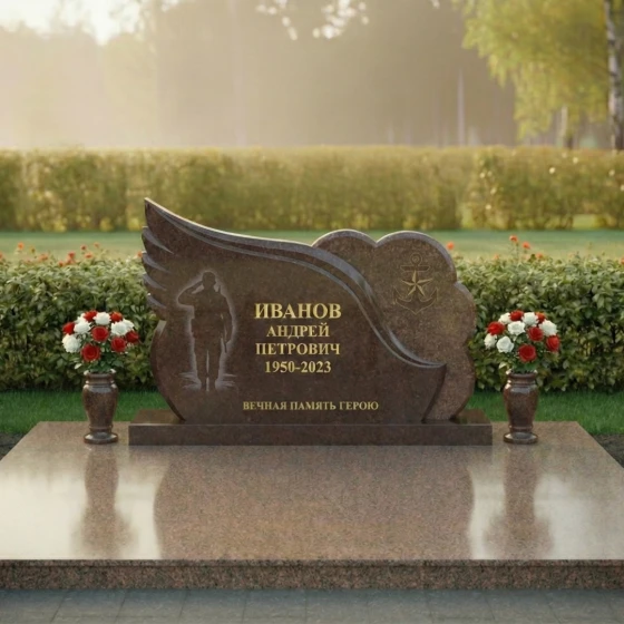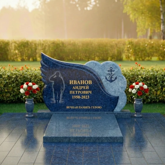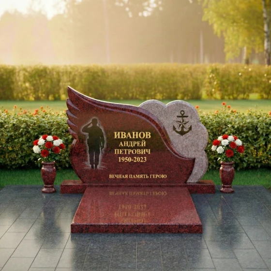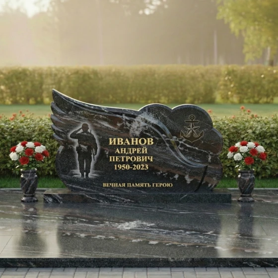 Центральная часть стелы представляет собой элегантную черную полированную поверхность, идеальную для нанесения портрета и данных усопшего. Здесь же, методом глубокой гравировки, прорисован силуэт воина, отдающего честь, что придает композиции особую торжественность и дань уважения. Правая часть стелы оформлена в виде облака с рельефным изображением якоря — символа надежды, верности и стабильности, часто ассоциирующегося с морской службой или жизненной стойкостью. Этот элемент выполнен из светлого, матового камня, создавая выразительный контраст с полированной черной основой и подчеркивая фактурное разнообразие материала.